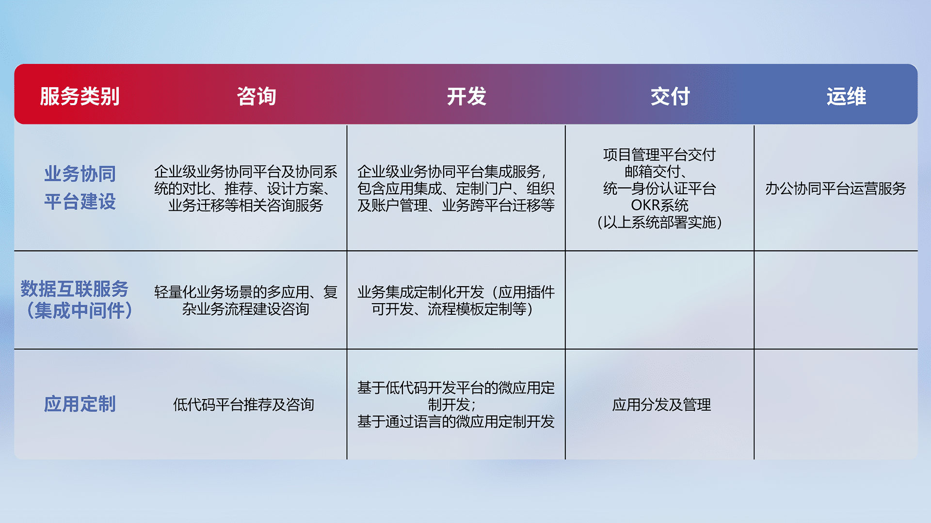 针对钉钉、、企微、、、IDaas等平台级产品提供产品的规划、、、、方案、、交付、、定制化开发等服务,,,实现如统一协同办公、、、智能客户服务、、、、混合会议管理、、、智能数据查询、、等业务场景,,,实现数字化转型。。。