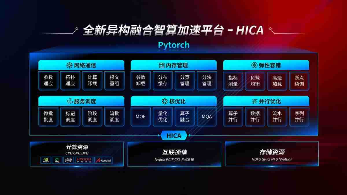 通过自研的服务层、、、中间适配层、、、、以及调度编排算法,,,采用数据并行、、模型并行等多种并行方式,,,把并行计算任务进行有效的分解,,,,使其分别由相应的软件栈和算力资源来承接。。。当GPU资源变化,,,HICA可以实时动态调度计算子任务并调整模型拓扑和架构,,,以充分聚合各种算力资源。。。。